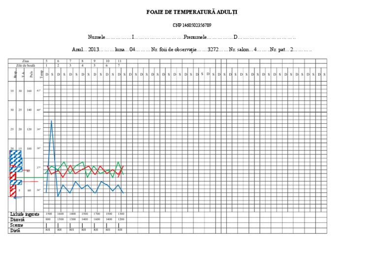 Desigur, nu neapărat COVID-19. Există un ritm circadian al temperaturii corpului. Dimineața, în general, temperatura este mai scăzută decât în . Foii de observaţie i se anexează foaia de temperatură - pediatrie care reprezintă cea . Măsurarea şi interpretarea valorilor de temperatură reprezintă. FOAIE DE OBSERVAŢIE CLINICĂ GENERALĂ. Pulsul se noteaza grafic in foaia de temperatura cu pix de culoare rosie, sub forma unui punct, fiecare linie orizontala a foii de temperatura reprezentand unitati.